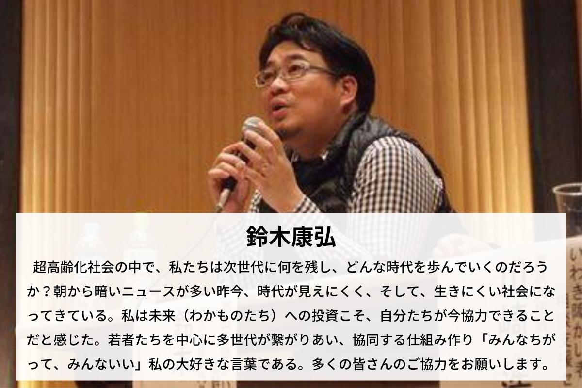 超高齢化社会の中で、私たちは次世代に何を残し、どんな時代を歩んでいくのだろうか?朝から暗いニュースが多い昨今、時代が見えにくく、そして、生きにくい社会になってきている。今回のプロジェクトを聞いて、私は未来(わかものたち)への投資こそ、自分たちが今協力できることだと感じた。若者たちを中心に多世代が繋がりあい、協同する仕組み作り「みんなちがって、みんないい」私の大好きな言葉である。是非、多くの皆さんのご協力をお願いします。