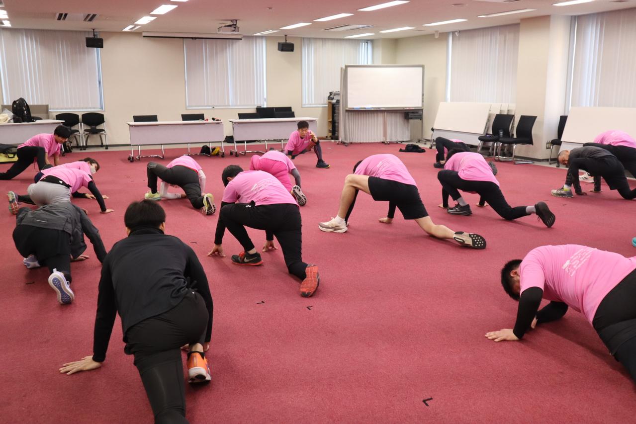 講師には奥野純也さまをお迎えし、練習前にはストレッチ方法やマラソンに向けた心構えなどをレクチャーしていただきました。