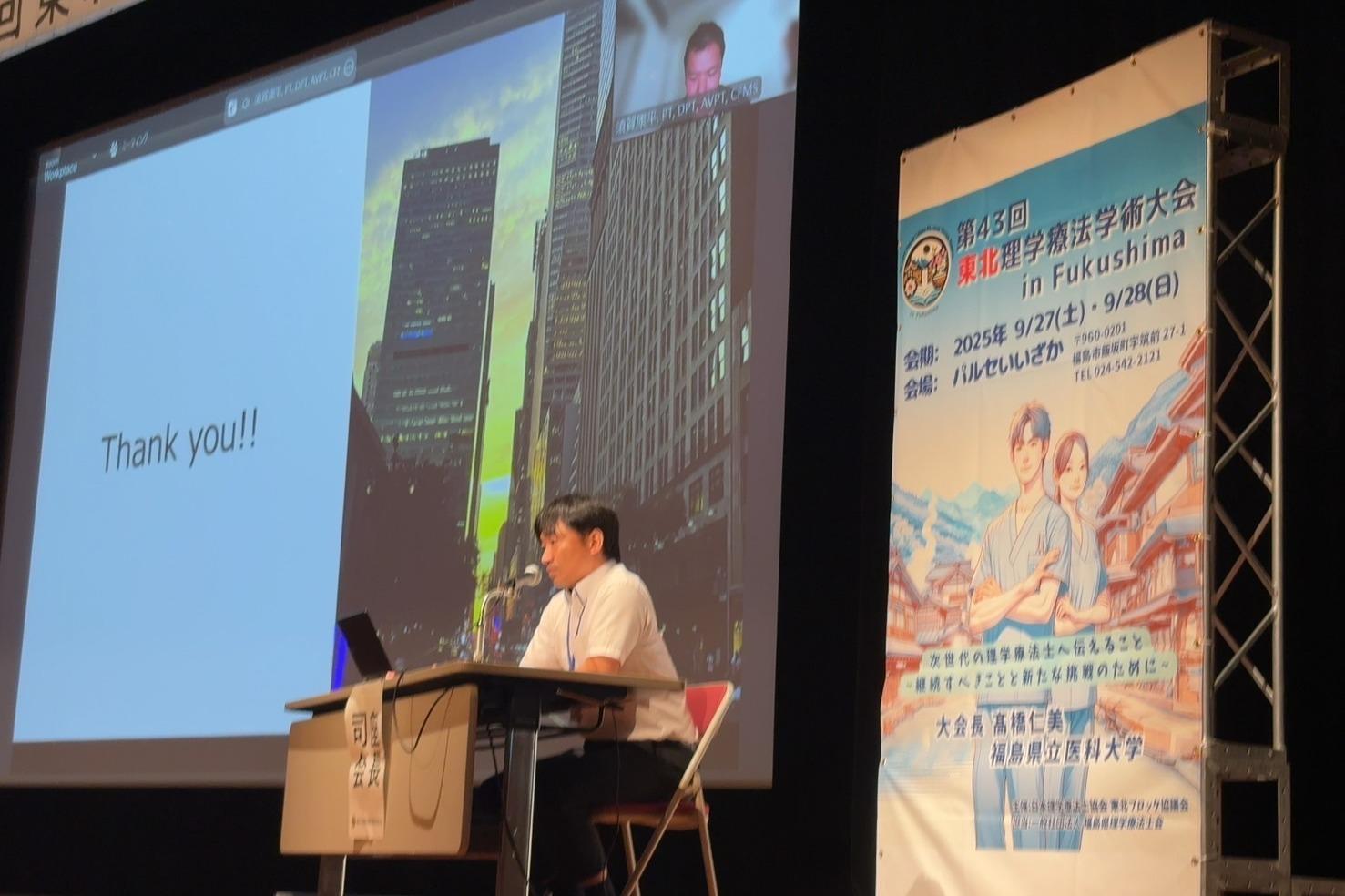 2025年9月27日(土)、28日(日)の2日間、福島県福島市飯坂町にて第43回東北理学療法学術大会が開催されました。この学術大会では、主に東北6県の理学療法士による研究発表や教育研修、セミナーなどの様々なプログラムが行われました。私は、アメリカで理学療法士として活躍されている須賀康平先生によるモーニングセミナー「挑戦と失敗を重ねたアメリカ理学療法士への軌跡:挑戦継続の意義」の司会を務めました。ご自身の現在のキャリアに至るまでに様々な研鑽を積み、視野を世界に広げるようになったことなどを伝えていただきました。会場では250名程度の来場者があり、オンライン講演でしたが講師の刺激的な講演と相まって熱気に包まれていました。