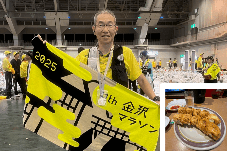 10月26日、金沢マラソンに参加しました。今シーズン初マラソン。ずっと小雨でしたが、寒くなく、コースも平坦であったことから、ここ数年ではベストの3時間39分10秒(ネット)でコールできました。ゴール後、第七ギョーザにてホワイト餃子をいただきました。40年ぶりのホワイト餃子はおいしかったです。次は12月の奈良マラソン、頑張ります。